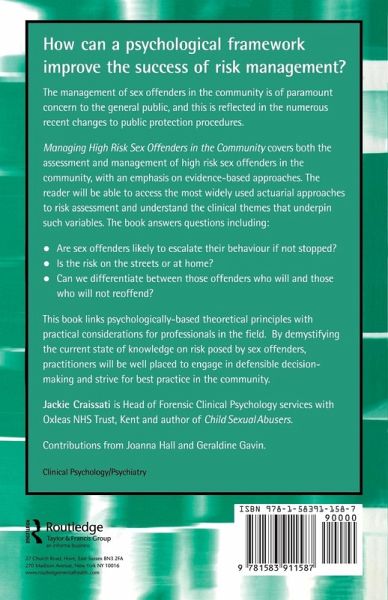 How can a psychological framework improve the success of risk management? The management of sex offenders in the community is of paramount concern to the general public, and this is reflected in the numberous recent changes to public protection procedures. Managing High Risk Sex Offenders in the Community covers both the assessment and management of high risk sex offenders in the community, with an emphasis on evidence-based approaches. The reader will be able to access the most widely used actuarial approaches to risk assessment and understand the clinical themes that underpin such variables. The book answers questions including: * Are sex offenders likely to escalate their behaviour if not stopped? * Is the risk on the streets or at home? * Can we differentiate between those offenders who will and those who will not reoffend? This book links psychologically-based theoretical principles with practical considerations for professionals in the field. By demystifying the current state of knowledge on risk posed by sex offenders, practitioners will be well placed to engage in defensible decision-making and strive for best practice in the community.