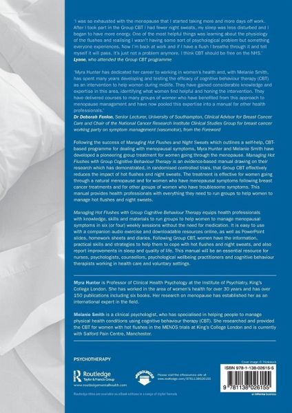 Myra Hunter is Professor of Clinical Health Psychology at the Institute of Psychiatry, King's College London. She has worked in the area of women's health for over 30 years and has over 150 publications including six books. Her research on menopause has established her as an international expert in the field. Melanie Smith is a clinical psychologist, who has specialised in helping people to manage physical health conditions using cognitive behaviour therapy (CBT). She researched and provided the CBT for women with hot flushes in the MENOS trials at King's College London and is currently with Salford Pain Centre, Manchester.