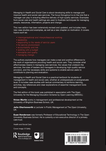 Managing in Health and Social Care is about developing skills to manage and improve health and social care services. The focus throughout is on the role that a manager can play in ensuring effective delivery of high-quality services. Examples from social care and health settings are used to illustrate techniques for managing people, resources, information, projects and change.