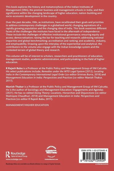 List of Figures. List of Tables. List of Contributors. Preface and Acknowledgements. 1. IIMs: Footprints, and Footsteps into the Future PART I: IIMs: BETWIXT THE NATIONAL AND THE GLOBAL 2. The Making of the First IIMs: Management School as a boundary object? 3. Institutional Influence of Management Education in Contemporary India: A Prismatic View 4. Internationalization of Business Education: Challenges and Opportunities 5. Signaling Quality: The Quest for International Ranking and Accreditation 6. Indian Public Business School: Pathways to Embracing Contradictions and Reclaiming Self 7. Reimaging IIMs: NEP 2020 and the Changing Institutional Governance PART II: IIMs: THE INSTITUTION AND THE PROFESSION 8. Indian Institutes of Management: An Uneasy Equilibrium? 9. Evolving Landscape of Management Education and Employability: Challenges and Contradictions 10. Bell the 'CAT': A Relook at the Common Admission Test 11. Academic Skating on Thin Ice: Mysteries of Traversing the Absurd, Bizarre and Comical Pathways to the Future 12. An Ethnographic Reflection of a Professor: Searching for "Relevant" Knowledge 13. Entrepreneurship in India: A Management Perspective PART III: IIMs: THE IDEA AND ITS MULTIPLE RENDITIONS 14. From Farmland to Management Institute: The Making of IIM Calcutta's Joka Campus 15. IIMC and the City: Distinctively Coupled 16. A Gramscian reading of IIM-Calcutta's Decision. Index