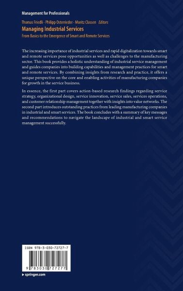 Part I: Theoretical Considerations.- Introduction to Managing Industrial Services.- Servitization of Manufacturing Companies.- Fundamentals of Industrial Service Management.- Service Strategy.- Organizational Structure.- Service Innovation.- Service Sales.- Service Operations.- Customer Relationship Management and the Value Network.- Outlook and Summary of Managing Industrial Services.- Part II: Insights from Practice.- Editorial to Managing Industrial Services: Insights from Practice.- Industrial Smart Services Facilitated by the Heidelberg Cloud.- Adaptive Service: Digital Service Platform and the Service Crowd Community.- Enabling the Dealer Network to Deliver Smart Services.- SKF: Rotating Equipment Performance, a Shift in Perspective-From Transactions to Outcomes.- Value Co-creation as Key to Customer Satisfaction in Digital Services Sales.- Applications of a Digital Twin for the Use of Compressed Air Stations: Concepts and Methods for Model-Based Automatic Planning, Design, Control, and Analysis of Compressed Air Stations.