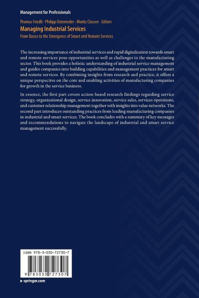 Part I: Theoretical Considerations.- Introduction to Managing Industrial Services.- Servitization of Manufacturing Companies.- Fundamentals of Industrial Service Management.- Service Strategy.- Organizational Structure.- Service Innovation.- Service Sales.- Service Operations.- Customer Relationship Management and the Value Network.- Outlook and Summary of Managing Industrial Services.- Part II: Insights from Practice.- Editorial to Managing Industrial Services: Insights from Practice.- Industrial Smart Services Facilitated by the Heidelberg Cloud.- Adaptive Service: Digital Service Platform and the Service Crowd Community.- Enabling the Dealer Network to Deliver Smart Services.- SKF: Rotating Equipment Performance, a Shift in Perspective-From Transactions to Outcomes.- Value Co-creation as Key to Customer Satisfaction in Digital Services Sales.- Applications of a Digital Twin for the Use of Compressed Air Stations: Concepts and Methods for Model-Based Automatic Planning, Design, Control, and Analysis of Compressed Air Stations.