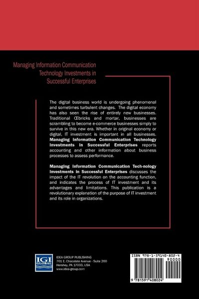 The digital business world is undergoing phenomenal and sometimes turbulent changes. The digital economy has also seen the rise of entirely new businesses. Traditional 'bricks and mortar' businesses are scrambling to become e-commerce businesses simply to survive in this new era. Whether in original economy or digital, IT investment is important in all businesses. Managing Information Communication Technology Investments in Successful Enterprises reports accounting and other information about business processes to assess performance. This book discusses the impact of the IT revolution on the accounting function, and indicates the process of IT investment and its advantages and limitations. This publication is a revolutionary explanation of the purpose of IT investment and its role in organizations.