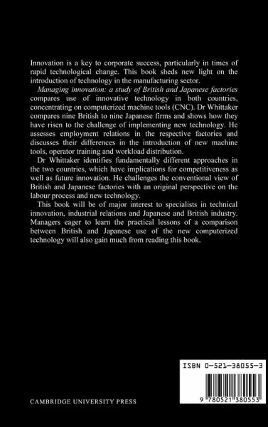 Innovation is a key to corporate success, particularly in times of rapid technological change. This book sheds new light on the introduction of technology in the manufacturing sector. The author considers the use of innovative technology in both Britain and Japan by examining nine firms in each country. He focuses on computerised machine tools (CNC) and shows how the various firms have risen to the challenge of implementing the new technology. Particular emphasis is placed on the differing employment relations in the factories, the nature of operating training and workload distribution. Dr Whittaker identifies fundamentally different approaches in the two countries which have implications for competiveness as well as future innovation. The contrast is especially attractive since Japanese industrial relations is commonly distinguished by its cooperative nature whilst industrial relations in Britain has tended to be more confrontational. These conventional views are challenged with an original perspective on the labour process and new technology. The book will be of major interest to specialists in technical innovation and industrial relations. Managers eager to learn the practical lessons of a comparison between British and Japanese work habits will also learn much from reading this book.