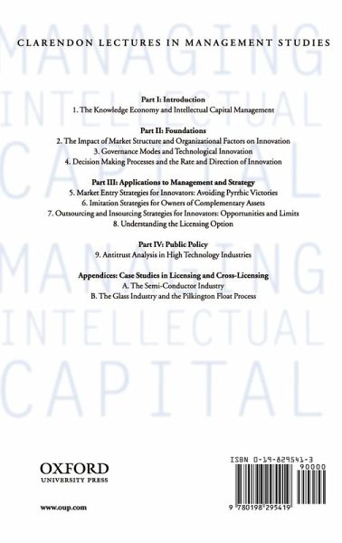* Part I: Introduction * Chapter 1: The Knowledge Economy and Intellectual Capital Management * Part II: Foundations * Chapter 2: Impact of Market Structure and Organizational Factors on Innovation * Chapter 3: Governance Modes and Technological Innovation * Chapter 4: Decision-making Processes and Technological Innovation (with Bercovitz and de Figueiredo) * Part III: Applications to Management and Strategy * Chapter 5: Market Entry Strategies for Innovators * Avoiding Pyrrhic Victories * Chapter 6: Imitation Strategies for Owners of Complementary Assets * Chapter 7: Outsourcing Strategies for Innovators * Opportunities and Limits (with Hank Chesbrough) * Chapter 8: Understanding the Licensing Option (with Peter Grindley and Edward Sherry) * Part IV: Public Policy * Chapter 9: Antitrust Analysis in High Technology Industries (with Mary Coleman) * Appendix * a) The Semiconductor Industry (with Peter Grindley) * b) The Glass Industry and the Pilkington Float Process (with Ed Sherry and Peter Grindley)