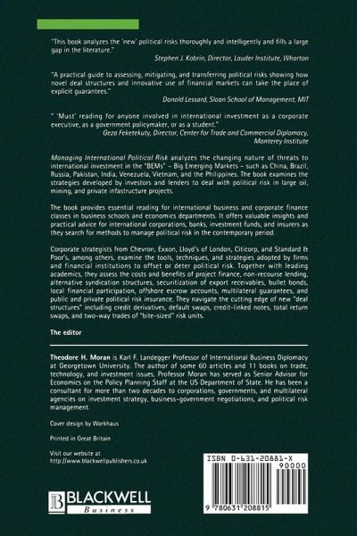 Managing International Political Risk analyzes the changing nature of threats to international investment in the "BEM's"- Big Emerging Markets- such as China, Brazil, Russia, Pakistan, India, Venezuela, Vietnam, and the Philippines. The book examines the strategies developed by investors and lenders to deal with political risk in large oil, mining, and private infrastructure projects. The book provides essential reading for international business and corporate finance classes in business schools and economics departments. It offers valuable insights and practical advice for international corporations, banks, investment funds, and insurers as they search fr methods to manage political risk in the contemporary period. Corporate strategies from Chevron, Exxon, Llotd's of London, Citicorp, and Standard & Poor's, among others, examine the tools, techniques, and stratgeies adopted by firms and financial institutions to offset or deter political risk. Together with leading academics, they assess the costs and benefits of project finance, non-recourse lending, alternative syndication structures, securization of export receivables, bullet bonds, local financial participation, offshore escrow accounts, multilateral guarentees, and public and private political risk insurance. They navigate the cutting edge of new "deal structures" including credit derivatives, default swars, credit- linked notes, total return swaps, and two-way trades of " bite-sized" risk units.