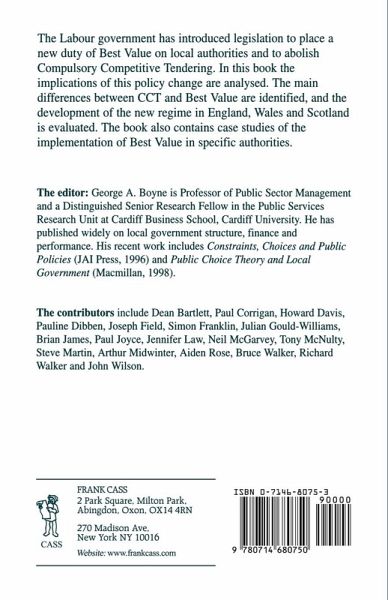 Introduction - processes performance and best value in local government George A. Boyne; perspectives on contractual relationships and the move to best value in local authorities Bruce Walker Howard David; from CCT to best value - some evidence and observations John Wilson; picking winners or piloting best value? an analysis of English best value bids Steve Martin; best value in Welsh local government - progress and prospects George A. Boyne et al; developing best value in Scotland - concepts and contradictions Arthur Midwinter Neil McGarvey; preparing for best value Dean Bartlett et al; a whole authority approach to testing and developing best value D. Brian James Joseph J. Field.
