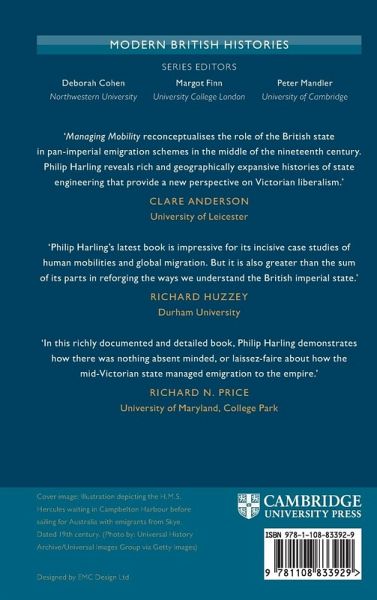 Between 1840 and 1860 the British Empire expanded rapidly in scale, with rampant annexation of territory and ruthless suppression of rebellion. These decades also witnessed an unprecedented movement of people across the Empire and around the world, with over 2.6 million emigrants leaving Britain in the 1850s alone. Managing Mobility examines how the British imperial state facilitated the mass migration of its impoverished subjects as labor assets, shipped across vast expanses of ocean to contribute to the economy of the Empire. Philip Harling analyzes the ideological framework which underpinned these interventions and discusses the journeys taken by emigrants across four continents, considering the varied outcomes of these significant projects of social engineering. In doing so, this study demonstrates how the British imperial state harnessed migration to ensure and maintain a racialised global economic order in the decades after Emancipation.