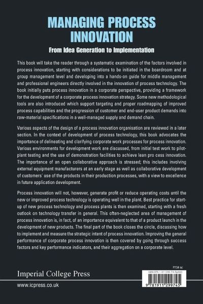 This book will take the reader through a systematic examination of the factors involved in process innovation. It starts with the considerations to be initiated in the boardroom and at group management level and develops into a hands-on guide for middle management and professional engineers directly involved in the innovation of process technology. The book initially puts process innovation in a corporate perspective, providing a framework for the development of a corporate process innovation strategy. Some new methodological tools are also introduced which support the targeting and proper roadmapping of improved process capabilities, and the progression of customer and end-user product demands, into raw-material specifications in a well-managed supply and demand chain.Various aspects of the design of a process innovation organisation are reviewed in a later section. In the context of the development of process technology, this book advocates the importance of delineating and clarifying corporate work processes. Various environments for development work are discussed, from initial test work to pilot-plant testing and the use of demonstration facilities to achieve lean process innovation. The importance of an open collaborative approach is stressed. This includes involving external equipment manufacturers at an early stage as well as collaborative development of customers' use of the products in their production processes, with a view to excellence in future application development.Process innovation will not, however, generate profit or reduce operating costs until the new or improved process technology is operating well in the plant. Best practice for start-up of new process technology and process plants is examined, starting with a fresh outlook on technology transfer in general. This often-neglected area of management of process innovation is, in fact, of an importance equivalent to that of a product launch in the development of new products. The final part of the book closes the circle, discussing how to implement and measure the strategic intent of process innovation. Improving the general performance of corporate process innovation is then covered by going through success factors and key performance indicators, and their aggregation on a corporate level.