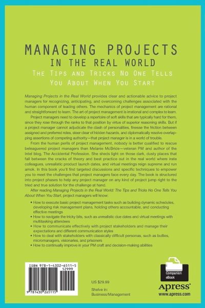 From the human perils of project management, nobody is better qualified to rescue beleaguered project managers than Melanie McBride veteran PM and author of the Intel blog, The Accidental Profession. She sheds light on those dark, dusty places that fall between the cracks of theory and best practice out in the real world where irate colleagues, unrealistic product launch dates, and virtual meetings reign supreme and run amok. In this book you ll find targeted discussions and specific techniques to empower you to meet the challenges that project managers face every day. The book is structured into project phases to help any project manager on any kind of project jump right to the tried and true solution for the challenge at hand.
