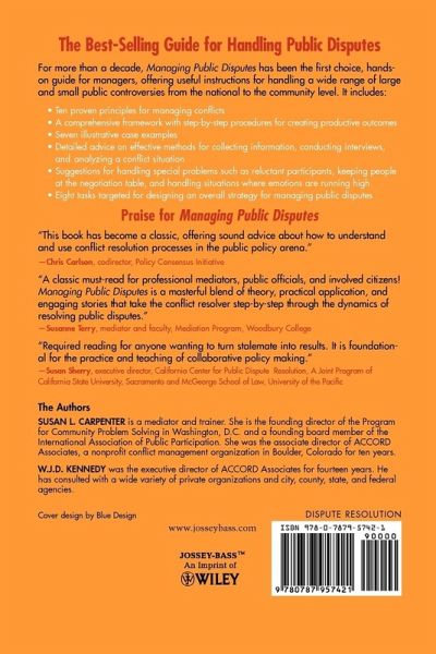 "A classic must-read for professional mediators, public officials,and involved citizens! Managing Public Disputes is a masterfulblend of theory, practical application, and engaging stories thattake the conflict resolver step-by-step through the dynamics ofresolving public disputes." (Susanne Terry, mediator and faculty,Mediation Program, Woodbury College)