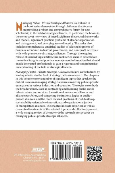A volume in Research in Strategic Alliances Series Editor T. K. Das, City University of New York Managing Public-Private Strategic Alliances is a volume in the book series Research in Strategic Alliances that focuses on providing a robust and comprehensive forum for new scholarship in the field of strategic alliances. In particular, the books in the series cover new views of interdisciplinary theoretical frameworks and models, significant practical problems of alliance organization and management, and emerging areas of inquiry. The series also includes comprehensive empirical studies of selected segments of business, economic, industrial, government, and non-profit activities with wide prevalence of strategic alliances. Through the ongoing release of focused topical titles, this book series seeks to disseminate theoretical insights and practical management information that should enable interested professionals to gain a rigorous and comprehensive understanding of the field of strategic alliances. Managing Public-Private Strategic Alliances contains contributions by leading scholars in the field of strategic alliance research. The chapters in this volume cover a number of significant topics that speak to the critical issues in managing strategic alliances involving public-private enterprises in various industries and countries. The topics cover both the broader issues, such as contracting and bundling public sector infrastructure and services, formation of innovation alliances and alliance portfolios, and competing institutional logics in public-private alliances, and the more focused problems of trust-building, sustainability-oriented co-innovation, and organizational justice in multipartner alliances. The chapters include empirical as well as conceptual treatments of the selected topics, and collectively present a wide-ranging review of the noteworthy research perspectives on managing public-private strategic alliances.