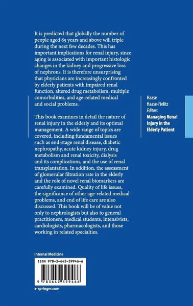As the number of people aged 65 years and above rises, physicians are increasingly confronted by elderly patients with impaired renal function, altered drug metabolism and multiple comorbidities. This book examines in detail the nature of renal injury in the elderly and its optimal management. A wide range of key topics are covered, including end-stage renal disease, diabetic nephropathy, acute kidney injury, drug metabolism and renal toxicity, dialysis and its complications and the use of renal transplantation. In addition, the assessment of glomerular filtration rate in the elderly and the role of novel renal biomarkers are carefully examined. Quality of life issues, the significance of other age-related medical problems and end of life care are also discussed. This book will be of value not only to nephrologists but also to general practitioners, medical students, intensivists, cardiologists, pharmacologists and those working in related specialties.