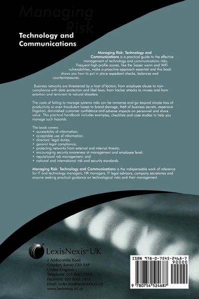 Managing Risk: Technology and Communications is a practical guide to the effective management of technology and communications risks. Frequent high profile scares, like the Sasser worm and WiFi vulnerabilities, make a proactive approach essential and this book shows you how to put in place expedient checks, balances and countermeasures.Business networks are threatened by a host of factors, from employee abuse to non-compliance with data protection and libel laws, from hacker attacks to viruses and from extortion and terrorism to natural disaster.The costs of failing to manage systems risks can be immense and go beyond simple loss of productivity or even fraudulent losses to brand damage, theft of business secrets, expensive litigation, diminished customer confidence and adverse impacts on personnel and share value. This practical handbook includes examples, checklists and case studies to help you manage such hazards.The book covers:¿ accessibility of information;¿ acceptable use of information;¿ directors' legal duties;¿ general legal compliance;¿ protecting networks from external and internal threats;¿ encouraging security awareness at management and employee level;¿ reputational risk management; and¿ national and international risk and security standards.Managing Risk: Technology and Communications is the indispensable work of reference for IT and technology managers, HR managers, IT legal advisors, company secretaries and anyone seeking practical guidance on technology risks and their management.