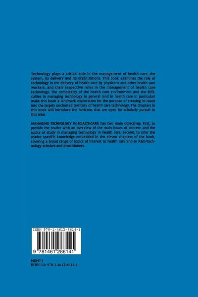 Managing Technology in Healthcare has two main objectives. First, to provide the reader with an overview of the main issues of concern and the topics of study in managing technology in health care. Second, to offer the reader specific knowledge embedded in the eleven chapters of the book, covering a broad range of topics of interest to health care and to R&D/technology scholars and practitioners.