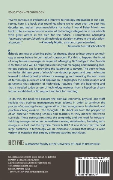 There have been many books about managing technology in education, but none have discussed the progressing role of the business manager to guide the school towards governing technology-until now. Managing Technology in Our Schools is for those who will not only be responsible for managing and financing technology budgets, but for providing the leadership to govern. The book reflects on the last thirteen years of schools' roundabout progress and uses the lessons learned to identify best practices for managing and financing the next wave of technology purchases and application.