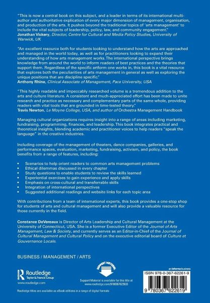 Part I Cultural Management Practices 1. Financial Management for Decision-Making in the Arts Constance DeVereaux 2. Fundraising in the Arts Victoria D. Alexandra and Oonagh Murphy 3. Arts Marketing David Ocón 4. Facilities Management Jim Richerson 5. Evaluation in the Arts Annabel Jackson Part II Performing and Visual Arts Management 6. Managing Art Galleries Melissa Rachleff 7. Theatre Management through Successful Collaboration Patrick J. Ebewo and Rachael Diang'a 8. Orchestra Leadership Njörður Sigurjónsson 9. Festival Management Practices Olga Kolokytha 10. Cultural Work Johanna Schindler Part III Law, Policy, and Advocacy 11. Cultural Policy Constance DeVereaux 12. Art Activism and Community Engagement Simone Wesner 13. Law and the Arts Constance DeVereaux