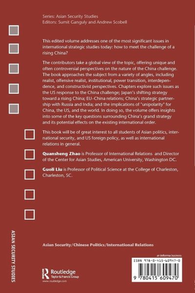 This edited volume addresses one of the most significant issues in international strategic studies today: how to meet the challenge of a rising China? The contributors take a global view of the topic, offering unique and often controversial perspectives on the nature of the China challenge. The book approaches the subject from a variety of angles, including realist, offensive realist, institutional, power transition, interdependence, and constructivist perspectives. Chapters explore such issues as the US response to the China challenge, Japan's shifting strategy toward a rising China, EU-China relations, China's strategic partnership with Russia and India, and the implications of "unipolarity" for China, the US and the world. In doing so, the volume offers insights into some of the key questions surrounding China's grand strategy and its potential effects on to the existing international order.