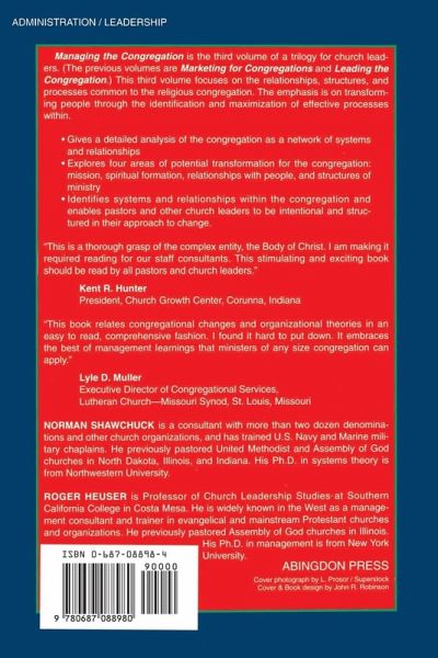 The third volume of Shawchuck and Heuser's trilogy, this title will focus on the relationships and processes common to the religious congregation. The emphasis will be on the identification and maximization of effective processes within church structures. Key Features: Detailed analysis of the congregation as a network of systems and relationships; Explores four areas of potential transformation for the congregation: mission, spiritual formation, relationship with people, and structures of ministry; Comprehensive format ideal for pastors and seminary students. Key Benefits: Identifying systems and relationships within the congregation enables church leaders to be intentional and structured in their approach to change; Emphasizes the concept of the "Continuous Improvement Project," which helps leaders to understand the on-going nature of organizational transformation; Contributes to our understanding of how to design, implement, or change systems within the congregation in order to enhance the effectiveness of ministry.
