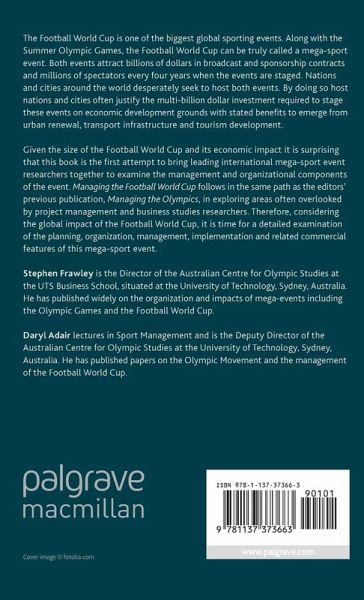 Managing the Football World Cup explores areas often overlooked by project management and business studies researchers. Therefore considering the global impact of the Football World Cup it is time for a detailed examination of the planning, organization, management, implementation and related commercial features of this mega-sport event.