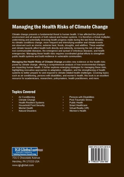 Climate change presents a fundamental threat to human health. It has affected the physical environment and all aspects of both natural and human systems. It is therefore a threat multiplier, undermining and potentially reversing health progress made during the last three decades. As climatic conditions change, more frequent and intensifying weather and climate events are observed such as storms, extreme heat, floods, droughts, and wildfires. These weather and climate hazards affect health both directly and indirectly, increasing the risk of deaths, non-communicable diseases, the emergence and spread of infectious diseases, and health emergencies. Managing these health risks requires coordinated global efforts to strengthen public health systems and build resilience in vulnerable communities. Managing the Health Risks of Climate Change provides new evidence on the health risks posed by climate change, offering a comprehensive analysis of how environmental changes are impacting human health. It further explores emerging strategies for managing these risks, highlighting innovative approaches to adaptation, mitigation, and the strengthening of health systems to better prepare for and respond to climate-related health challenges. Covering topics such as air conditioning, persons with disabilities, and women's health, this book is an excellent resource for academicians, researchers, policymakers, health practitioners, and more.