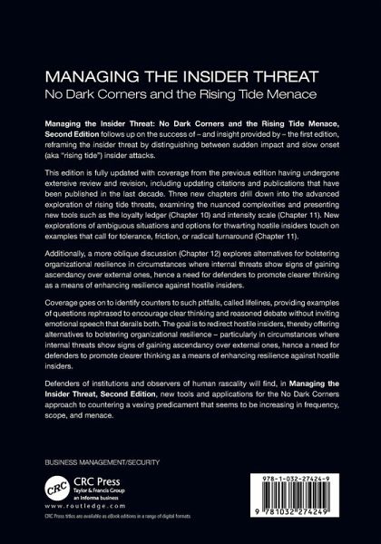 Managing the Insider Threat: No Dark Corners and the Rising Tide Menace, Second Edition follows up on the success ofâ and insight provided byâ the first edition, reframing the insider threat by distinguishing between sudden impact and slow onset (aka "rising tide") insider attacks.