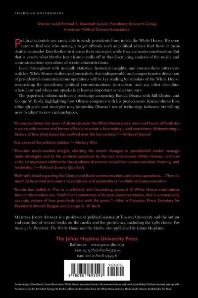 Political scientists are rarely able to study presidents from inside the White House while presidents are governing, campaigning, and delivering thousands of speeches. It's even rarer to find one who manages to get officials such as political adviser Karl Rove or presidential counselor Dan Bartlett to discuss their strategies while those strategies are under construction. But that is exactly what Martha Joynt Kumar pulls off in her fascinating new book, which draws on her first-hand reporting, interviewing, and original scholarship to produce analyses of the media and communications operations of the past four administrations, including chapters on George W. Bush and Bill Clinton. Kumar describes how today's White House communications and media operations can be at once in flux and remarkably stable over time. She describes how the presidential Press Office that was once manned by a single presidential advisor evolved into a multilayered communications machine that employs hundreds of people, what modern presidents seek to accomplish through their operations, and how presidents measure what they get for their considerable efforts. Laced throughout with in-depth statistics, historical insights, and you-are-there interviews with key White House staffers and journalists, this indispensable and comprehensive dissection of presidential communications operations will be key reading for scholars of the White House researching the presidency, political communications, journalism, and any other discipline where how and when one speaks is at least as important as what one says.