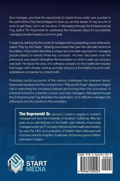 As a manager, you have the opportunity to inspire those under your purview to the point where they feel privileged to have you as their leader. It may be a lot of work to get there, but it can be done. In Managing through the Entrepreneurial Fog, author Tim Koprowski Sr. addresses the necessary steps for successfully managing people toward a common goal. It begins by delving into the world of management by presenting a new philosophy called "Play by the Rules." Sharing anecdotes that give the rationale behind its foundation, Koprowski describes a unique and complete approach to managing people based on twenty-three key concepts. He then discusses how this philosophy was used to strengthen the foundation on which a start-up company was built. He traces the story of a software company for the healthcare industry that began with virtually nothing and later became a formidable force for wellestablished companies to contend with. Providing candid accounts of the various challenges the business faced, Koprowski explains how the concepts from "Play by the Rules" played an integral role in examining the company's failures and turning them into successes. A practical tutorial for potential, current, and new managers, Managing through the Entrepreneurial Fog illustrates the application of an effective management philosophy put into practice in the workplace.