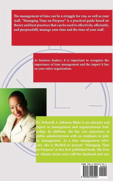 The management of time can be a struggle for you, as well as your staff, "Managing Time on Purpose" is a practical guide based on theory and best practices that can be used to effectively, efficiently, and purposefully manage your time and the time of your staff. As business leaders, it is important to recognize the importance of time management and the impact it has on your entire organization. Dr. Deborah A. Johnson-Blake is an educator and expert in management and organizational leadership. In addition, she has vast experience in public administration with an emphasis in public management. As a time management advocate, she is thrilled to present "Managing Time on Purpose" as her first published book. She lives in the Atlanta metro area with her husband and son.