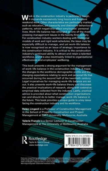 Work in the construction industry is particularly tough. It demands excessively long hours and frequent weekend work, and imposes re-location, job insecurity and other distinctive behavioural patterns. It may be difficult to manage, yet the work-life balance is of strategic importance to the construction industry, critical to attracting and retaining a talented workforce, to organizational effectiveness and employees' well-being. This book maps the changes to the workforce demographic profile and changing expectations relating to work and personal life, as well as legal imperatives. It presents work-life balance theory and along with extensive empirical data, along with practical advice.