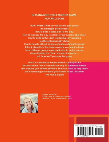 MANAGING YOUR BUSINESS GAME The Art of Client Entertainment Managing Your Business Game is a manual designed to help managers and sales people use the game of golf as a strategic business tool. The conference offered, which walks hand-in-hand with this publication, will show you how to make the day at the golf course work for you. The key to business is relationship management - building, maintaining and improving relationships with key business partners, suppliers and customers. Used properly, the golf course offers the perfect environment to establish rapport, develop trust and learn more about a client's business needs. ¿ Set clear objectives ¿ Choose the right customers to entertain ¿ Assure play is enjoyable and productive ¿ Manage the day to a positive next step ¿ Whether you are playing one-on-one with a client or sponsoring a corporate event, you will learn how to maximize the impact of your golf entertainment effort. Look for a Conference Near You! www.meganyounkman.com
