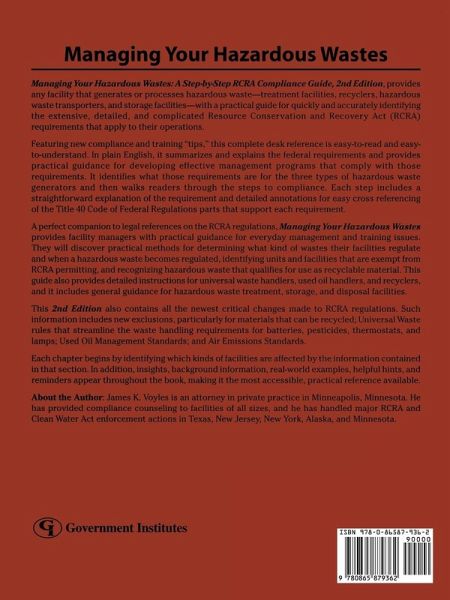 This 2nd Edition provides any facility that generates or processes hazardous waste-treatment facilities, recyclers, hazardous waste transporters, and storage facilities-with a practical guide for quickly and accurately identifying the extensive, detailed, and complicated Resource Conservation and Recovery Act (RCRA) requirements that apply to their operations. Featuring new compliance and training "tips," this complete desk reference is easy to read and easy to understand. In plain English, it summarizes and explains the federal requirements and provides practical guidance for developing effective management programs that comply with those requirements.