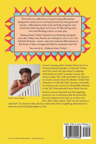 From the Back Cover This book is a collection of empowering affirmations designed to assist you in moving forward on your goals and dreams. Affirmations truly work and help program your mind into believing them to be true. It's like having your own cheerleading system on auto play. Mañana Starts Today! Expand your thinking and ignite your day. Today your dreams are waiting for you to act. You will find 49 heart-, mind-, and soul-centered affirmations in this book. It takes courage and faith to jumpstart your life. You can do it...Mañana Starts Today! Award-winning author Sandra Elaine Scott is a Transformational Speaker, Corporate Trainer, and Life Coach who specializes in helping individuals turn their someday dreams into today's reality. Her well-loved book "In Memory of a Saint: Lessons from My Mother I Didn't Pay Attention to Until She Died" became a bestseller on Amazon and received an Honorable Mention in the 2012 International Latino Book Awards. Sandra's unwavering faith and her beguiling positivity are so infectious that all around her become empowered to find joy in their own lives. She is often asked, "How do you remain so cheerful?" In answer to that, she has written this book of uplifting affirmations to share her powerful philosophies on life. Her most fervent wish is to create a movement where millions live the lives of their dreams by turning their Mañanas into Today.