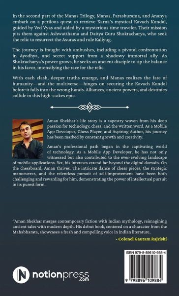 In the second part of the Manas Trilogy, Manas, Parashurama, and Ananya embark on a perilous quest to retrieve Karna's mystical Kavach Kundal, guided by Ved Vyas and aided by a mysterious time traveler. Their mission pits them against Ashwatthama and Daitya Guru Shukracharya, who seek the relic to resurrect the Asuras and rule Kaliyug. The journey is fraught with ambushes, including a pivotal confrontation in Ayodhya, and secret support from a shadowy immortal ally. As Shukracharya's power grows, he seeks an ancient disciple to tip the balance in his favor, intensifying the race for the relic. With each clash, deeper truths emerge, and Manas realizes the fate of humanity-and the multiverse-hinges on securing the Kavach Kundal before it falls into the wrong hands. Alliances, ancient powers, and destinies collide in this high-stakes epic.