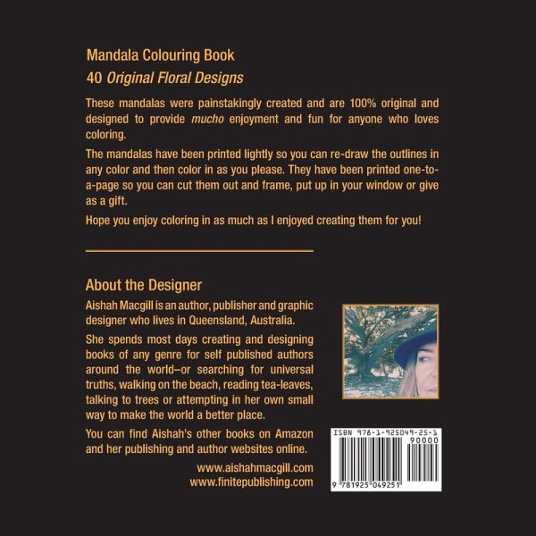 Mandala Colouring Book 40 Original Floral Designs These mandalas were painstakingly created and are 100% original and designed to provide mucho enjoyment and fun for anyone who loves coloring. The mandalas have been printed lightly so you can re-draw the outlines in any color and then color in as you please. They have been printed one-to-a-page so you can cut them out and frame, put up in your window or give as a gift.