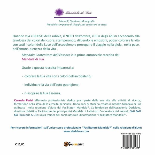 Carmela Parisi ideatrice del metodo Mandala di Fuà realizza Mandala di auto-guarigione. Con le infinite interazioni di forme, simboli, numeri e colori il Mandala esercita il suo potere di auto-guarigione psichico-animico e spirituale su chi lo realizza e chi lo colora. Colorare il Mandala è una pratica che consente di accedere al nostro mondo invisibile, comunicare con se stessi, ascoltare i messaggi che si celano nelle figure, nelle linee, nel colore. I Mandala di Fuà sono contenitori e aspettano di essere colorati. I colori sveleranno alla mente conscia - attivando un processo di consapevole evoluzione e crescita personale - la tua Essenza . Quando il cuore ti sussurra che sei ormai pronto, prendi il primo colore, lo senti vibrare ... non pensare, non lasciare che sia il giudizio, la mente a guidare la tua scelta... I Mandala di Fuà tutti realizzati con la mano che coglie i moti del cuore sono Mandala di auto-guarigione. Colorando il Mandala di Fuà, darai colore alla tua Essenza e scoprirai un valido alleato per superare disagi, sofferenze, disarmonie.