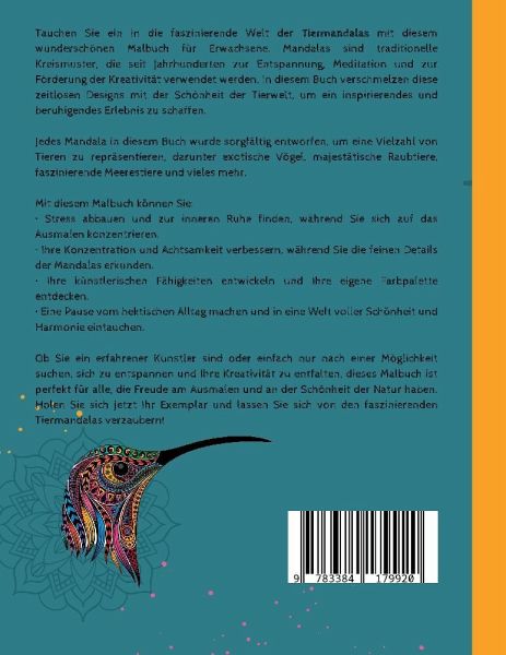 Tier Mandala MalbuchTauchen Sie ein in die faszinierende Welt der Tiermandalas mit diesem wunderschönen Malbuch für Erwachsene. Mandalas sind traditionelle Kreismuster, die seit Jahrhunderten zur Entspannung, Meditation und zur Förderung der Kreativität verwendet werden. In diesem Buch verschmelzen diese zeitlosen Designs mit der Schönheit der Tierwelt, um ein inspirierendes und beruhigendes Erlebnis zu schaffen.Jedes Mandala in diesem Buch wurde sorgfältig entworfen, um eine Vielzahl von Tieren zu repräsentieren, darunter exotische Vögel, majestätische Raubtiere, faszinierende Meerestiere und vieles mehr. Mit diesem Malbuch können Sie:-Stress abbauen und zur inneren Ruhe finden, während Sie sich auf das Ausmalen konzentrieren.-Ihre Konzentration und Achtsamkeit verbessern, während Sie die feinen Details der Mandalas erkunden.-Ihre künstlerischen Fähigkeiten entwickeln und Ihre eigene Farbpalette entdecken.-Eine Pause vom hektischen Alltag machen und in eine Welt voller Schönheitund Harmonie eintauchen.Ob Sie ein erfahrener Künstler sind oder einfach nur nach einer Möglichkeit suchen, sich zu entspannen und Ihre Kreativität zu entfalten, dieses Malbuch ist perfekt für alle, die Freude am Ausmalen und an der Schönheit der Natur haben. Holen Sie sich jetzt Ihr Exemplar und lassen Sie sich von den faszinierenden Tiermandalas verzaubern!