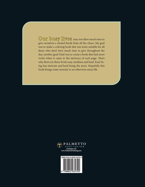 Our busy lives may not allow much time to give ourselves a mental break from all the chaos. My goal was to make a coloring book that was more suitable for all those who don't have much time to give throughout the day; another goal I had was to create a book that had more verity when it came to the intricacy of each page. That's why there are three levels easy, medium and hard. Easy being less intricate and hard being the most. Hopefully this book brings some serenity to an otherwise noisy life.