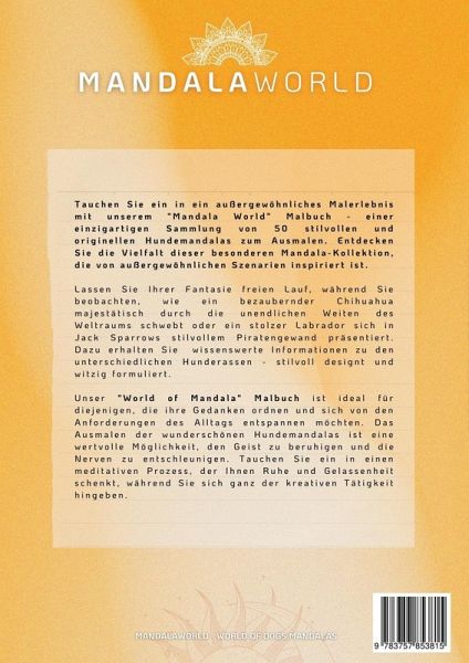 Tauchen Sie ein in ein außergewöhnliches Malerlebnis mit unserem "Mandala World" Malbuch - einer einzigartigen Sammlung von 50 stilvollen und originellen Hundemandalas zum Ausmalen.Entdecken Sie die Vielfalt dieser besonderen Mandala-Kollektion, die von außergewöhnlichen Szenarien inspiriert ist. Lassen Sie Ihrer Fantasie freien Lauf, während Sie beobachten, wie ein bezaubernder Chihuahua majestätisch durch die unendlichen Weiten des Weltraums schwebt oder ein stolzer Labrador sich in Jack Sparrows stilvollem Piratengewand präsentiert. Jedes Motiv wurde mit Liebe zum Detail und einer Prise…mehr