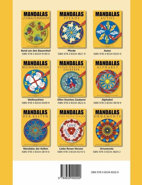 Mandalas AutosKinder können sich stundenlang mit Mandalas beschäftigen. Deshalb gibt es viele Erzieherinnen, die Mandalas in Kindergärten einsetzen. Das Ausmalen fordert Geduld, Farbgefühl und Konzentration. Das fertige Mandala wird so zum individuellen Erfolgserlebnis.Mandalas werden bis in die heutige Zeit als Meditationshilfe verwendet. Die Anordung um ein Zentrum hilft bei der Findung der inneren Mitte und entspannt den Geist in einer heutzutage immer schneller und lauter werdenden Umwelt.Es macht Spaß, die Wirkung beim Ausmalen selbst zu erleben!Alle MANDALA-Bände dieser Reihe:· Mandalas Rund um den Bauernhof· Mandalas Pferde· Mandalas Autos· Mandalas Weihnachten· Mandalas Elfen Drachen Zauberer· Mandalas Alphabet· Mandalas der Kelten· Mandalas Ornamente· Mandalas Liebe Rosen Herzen