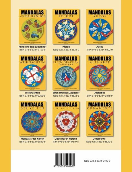 Mandalas rund um den BauernhofMandalas werden bis in die heutige Zeit als Meditationshilfe verwendet. Die Anordung um ein Zentrum hilft bei der Findung der inneren Mitte und entspannt den Geist in einer heutzutage immer schneller und lauter werdenden Umwelt.Kinder können sich stundenlang mit Mandalas beschäftigen. Deshalb gibt es viele Erzieherinnen, die Mandalas in Kindergärten einsetzen. Das Ausmalen fordert Geduld, Farbgefühl und Konzentration. Das fertige Mandala wird so zum individuellen Erfolgserlebnis.Es macht Spaß, die Wirkung beim Ausmalen selbst zu erleben!Alle MANDALA-Bände dieser Reihe:· Mandalas Rund um den Bauernhof· Mandalas Pferde· Mandalas Autos· Mandalas Weihnachten· Mandalas Elfen Drachen Zauberer· Mandalas Alphabet· Mandalas der Kelten· Mandalas Ornamente· Mandalas Liebe Rosen Herzen