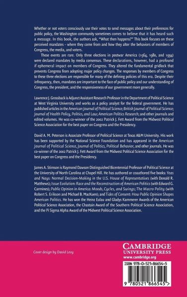 Whether or not voters consciously use their votes to send messages about their preferences for public policy, the Washington community sometimes comes to believe that it has heard such a message. In this 2006 book the authors ask 'What then happens?' They focus on these perceived mandates - where they come from and how they alter the behaviors of members of Congress, the media, and voters. These events are rare. Only three elections in post-war America (1964, 1980 and 1994) were declared mandates by the media consensus. These declarations, however, had a profound if ephemeral impact on members of Congress. They altered the fundamental gridlock that prevents Congress from adopting major policy changes. The responses by members of Congress to these three elections are responsible for many of the defining policies of this era. Despite their infrequency, then, mandates are important to the face of public policy.