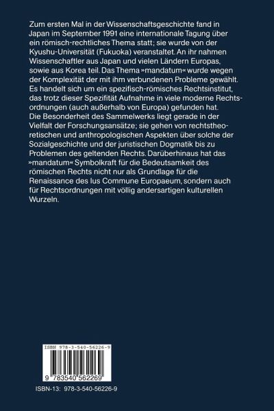 I. Allgemeines.- Das Recht des mandatum und sein Einfluß auf das gegenwärtige Recht verschiedener Länder.- Mandatum, fides, amicitia.- Die Prozeßformeln der actio mandati. Ein Beitrag zur Geschichte des prätorischen Edikts.- Mandatum im römischen öffentlichen Recht?.- II. Quellen.- Haftungsübernahme durch Auftrag? Eine Urkunde aus dem Jahre 48 n. Chr..- Das Mandat in Texten des Syrisch-Römischen Rechtsbuches.- Die Berücksichtigung der Basiliken durch Mommsen bei der Edition von D. 17,1 am Beispiel D. 17,1,38 (Marcellus 1. sing, resp.).- Die actio utilis institoria in den byzantinischen Rechtsquellen.- III. Das Verhältnis zwischen Mandanten und Mandatar.- Die Schulkontroverse bei Überschreitung des Auftrags zum Grundstückskauf.- Zu Problemen der renuntiatio mandati bei Gaius D. 17,1,27,2 (9 ed. prov.).- Einige Fragen zum Erlöschen des Mandats.- Mandatum und Bürgenregreß.- Der Auftrag und die sogenannten Innominatkontrakte.- Zur vertraglosen Haftung des Ratgebers.- Die Haftung des Auftraggebers für Schäden des Beauftragten. Zur Entstehung des 650 (3) des japanischen BGB.- IV. Mandatum und Ermächtigung.- Drittwirkungen des Mandats und ähnlicher Rechtsverhältnisse.- Traditio rei alienae volúntate domini.- Der Verkäufer als cognitor und als procurator in rem suam im römischen Eviktionsprozeß der klassischen Zeit.- Das Verhältnis zwischen Auftrag und Vollmacht.- V. Sozialgeschichtliche Probleme.- Salarium und ähnliche Leistungsentgelte beim mandatum.- Mandat und operae libertorum.- Das Mandat zum Freikauf.- Zur Bedeutung des Mandates im Baurecht.- "Adulescens luxuriosus" Ulp. D. 17.1.12.11 - ein Mandat contra bonos mores?.- Quellenregister.
