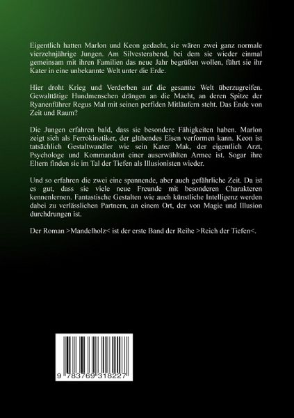 Eigentlich hatten Marlon und Keon gedacht, sie wären zwei ganz normale vierzehnjährige Jungen. Am Silvesterabend, bei dem sie wieder einmal gemeinsam mit ihren Familien das neue Jahr begrüßen wollen, führt sie ihr Kater in eine unbekannte Welt unter die Erde. Hier droht Krieg und Verderben auf die gesamte Welt überzugreifen. Gewalttätige Hundmenschen drängen an die Macht, an deren Spitze der Ryanenführer Regus Mal mit seinen perfiden Mitläufern steht. Das Ende von Zeit und Raum? Die Jungen erfahren bald, dass sie besondere Fähigkeiten haben. Marlon zeigt sich als Ferrokinetiker, der glühendes Eisen verformen kann. Keon ist tatsächlich Gestaltwandler wie sein Kater Mak, der eigentlich Arzt, Psychologe und Kommandant einer auserwählten Armee ist. Sogar ihre Eltern finden sie im Tal der Tiefen als Illusionisten wieder. Und so erfahren die zwei eine spannende, aber auch gefährliche Zeit. Da ist es gut, dass sie viele neue Freunde mit besonderen Charakteren kennenlernen. Fantastische Gestalten wie auch künstliche Intelligenz werden dabei zu verlässlichen Partnern, an einem Ort, der von Magie und Illusion durchdrungen ist. Der Roman >Mandelholz< ist der erste Band der Reihe >Reich der Tiefen<.