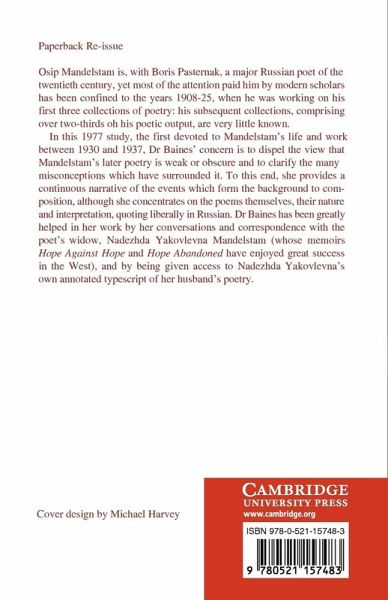 Osip Mandelstam is, with Boris Pasternak, a major Russian poet of the twentieth century, yet most of the attention paid him by modern scholars has been confined to the years 1908-1925, when he was working on his first three collections of poetry: his subsequent collections, comprising over two-thirds of his poetic output, are very little known. In this 1977 study, the first devoted to Mandelstam's life and work between 1930 and 1937, Dr Baines' concern is to dispel the view that Mandelstam's later poetry is weak or obscure and to clarify the many misconceptions which have surrounded it. To this end, she provides a continuous narrative of the events which form the background to composition, although she concentrates on the poems themselves, their nature and interpretation, quoting liberally in Russian.