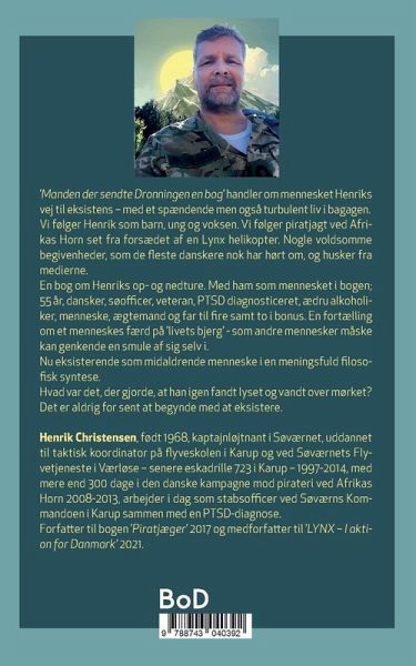 ¿Manden der sendte Dronningen en bog¿ handler om mennesket Henriks vej til eksistens ¿ med et spændende men også turbulent liv i bagagen. Vi følger Henrik som barn, ung og voksen. Vi følger piratjagt ved Afrikas Horn set fra forsædet af en Lynx helikopter. Nogle voldsomme begivenheder, som de fleste danskere nok har hørt om, og husker fra medierne. En bog om Henriks op- og nedture. Med ham som mennesket i bogen; 55 år, dansker, søofficer, veteran, PTSD diagnosticeret, ædru alkoholiker, menneske, ægtemand og far til fire samt to i bonus. En fortælling om et menneskes færd på ¿livets bjerg¿ - som andre mennesker måske kan genkende en smule af sig selv i. Nu eksisterende som midaldrende menneske i en meningsfuld syntese i en filosofisk perception. Hvad var det, der gjorde, at han igen fandt lyset og vandt over mørket? Det er aldrig for sent at begynde med at eksistere.