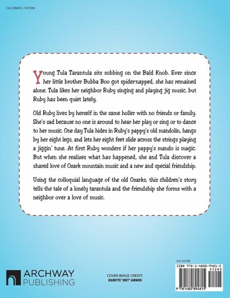 Young Tula Tarantula sits sobbing on the Bald Knob. Ever since her little brother Bubba Boo got spider-napped, she has remained alone. Tula likes her neighbor Ruby singing and playing jig music, but Ruby has been quiet lately. Old Ruby lives by herself in the same holler with no friends or family. She's sad because no one is around to hear her play or sing or to dance to her music. One day Tula hides in Ruby's pappy's old mandolin, hangs by her eight legs, and lets her eight feet slide across the strings playing a jiggin' tune. At first Ruby wonders if her pappy's mando is magic. But when she realizes what has happened, she and Tula discover a shared love of Ozark mountain music and a new and special friendship. Using the colloquial language of the old Ozarks, this children's story tells the tale of a lonely tarantula and the friendship she forms with a neighbor over a love of music.
