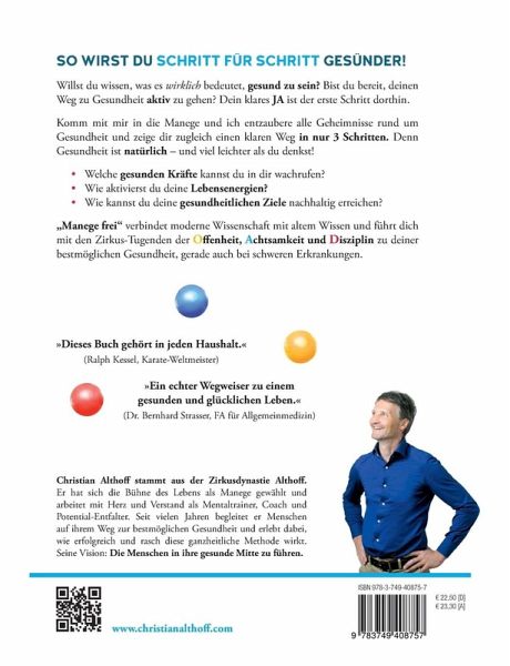So wirst du Schritt für Schritt gesünder!Willst du wissen, was es wirklich bedeutet, gesund zu sein? Bist du bereit, deinen Weg zu Gesundheit aktiv zu gehen? Dein "JA" ist der erste Schritt dorthin.Komm mit mir in die Manege und ich entzaubere alle Geheimnisse, die es zum Thema Gesundheit gibt. Du erfährst, was auf ganzheitlicher Ebene notwendig ist für ein gesundes Leben, und wie du es konkret in 3 Schritten gestalten kannst: - Welche gesunden Kräfte kannst du in dir wachrufen?- Wie aktivierst du deine Lebensenergien? - Wie kannst du deine gesundheitlichen Ziele nachhaltig erreichen?"Manege frei" verbindet moderne Wissenschaft mit altem Wissen und führt dich mit den Zirkus-Tugenden Offenheit, Achtsamkeit und Disziplin zu deiner bestmöglichen Gesundheit, gerade auch bei schweren Erkrankungen.