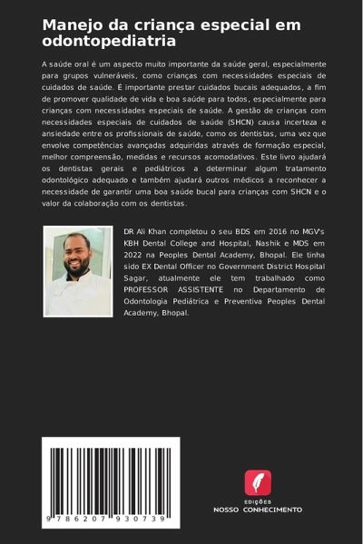 A saúde oral é um aspecto muito importante da saúde geral, especialmente para grupos vulneráveis, como crianças com necessidades especiais de cuidados de saúde. É importante prestar cuidados bucais adequados, a fim de promover qualidade de vida e boa saúde para todos, especialmente para crianças com necessidades especiais de saúde. A gestão de crianças com necessidades especiais de cuidados de saúde (SHCN) causa incerteza e ansiedade entre os profissionais de saúde, como os dentistas, uma vez que envolve competências avançadas adquiridas através de formação especial, melhor compreensão, medidas e recursos acomodativos. Este livro ajudará os dentistas gerais e pediátricos a determinar algum tratamento odontológico adequado e também ajudará outros médicos a reconhecer a necessidade de garantir uma boa saúde bucal para crianças com SHCN e o valor da colaboração com os dentistas.