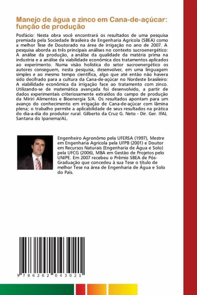 Posfácio: Nesta obra você encontrará os resultados de uma pesquisa premiada pela Sociedade Brasileira de Engenharia Agrícola (SBEA) como a melhor Tese de Doutorado na área de irrigação no ano de 2007. A pesquisa aborda as três principais análises no contexto sucroenergético: A análise da produção, a análise da qualidade da matéria prima na industria e a análise da viabilidade econômica dos tratamentos aplicados ao experimento. Numa visão holística do setor sucroenergético os autores conseguem, nesta pesquisa, desenvolver, em uma linguagem simples e ao mesmo tempo científica, algo que até então não havera sido decifrado para a cultura da Cana-de-açúcar no Nordeste brasileiro: A viabilidade econômica da irrigação face ao tratamento com zinco. Utilizando-se de matemática avançada foi desenvolvido, a partir de dados experimentais criteriosamente extraídos do campo de produção da Miriri Alimentos e Bioenergia S/A. Os resultados apontam para um avanço do conhecimento em irrigação de Cana-de-açúcar com lâmina plena; o trabalho permite a aplicabilidade de seus resultados na prática do dia-a-dia do produtor rural. Gilberto da Cruz G. Neto - Dir. Ger. IFAL Santana do Ipanema/AL.